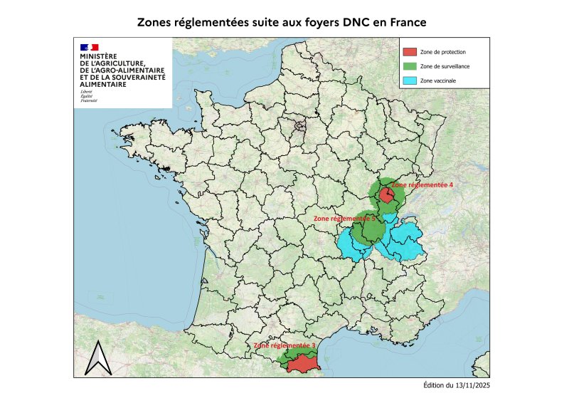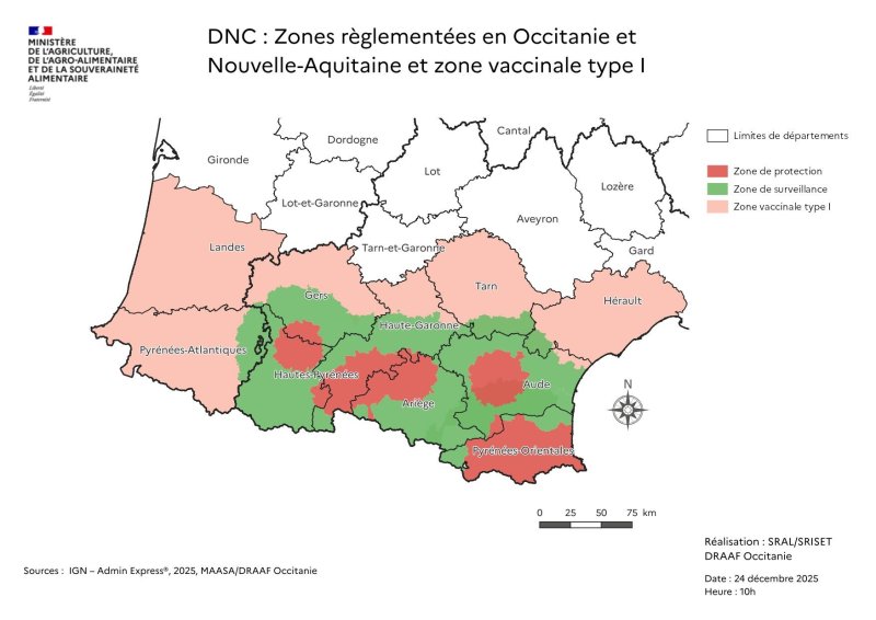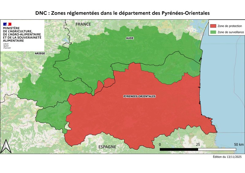 16 octobre 2025. La confirmation de 3 foyers dans les Pyrénées-Orientales (66) induit la mise en place d’une zone de protection dans le département des Pyrénées-Orientales ainsi que d’une zone de surveillance dans les Pyrénées-Orientales (66), l’Aude (11) et l’Ariège (09).