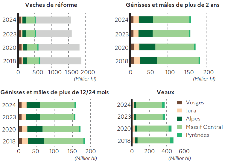 La production des animaux de boucherie recouvre les vaches de réforme, les génisses et mâles de plus de 2 ans, les génisses et mâles de 1 à 2 ans, les génisses et mâles de 8 à 12 mois et les veaux (de boucherie et sous la mère). Le massif des Pyrénées contribue peu à la production d’animaux de boucherie des massifs métropolitains, la production de veaux y est un peu plus significative. Les productions bouchères sont le fait principal des zones hors massif, nord-ouest notamment (Cf. Graphique 4).