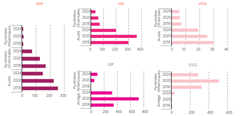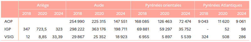 Le massif des Pyrénées produit en moyenne, pour la période 2018-2024, 750 000 hl de vin dont 82 % du volume est valorisé en AOP. Les départements de l’Aude et des Pyrénées Orientales réalisent 96 % des volumes du massif, mais subissent une baisse importante de la production, en raison principalement de la sécheresse qui affectent ces territoires (Cf graphique 6).