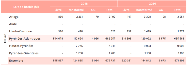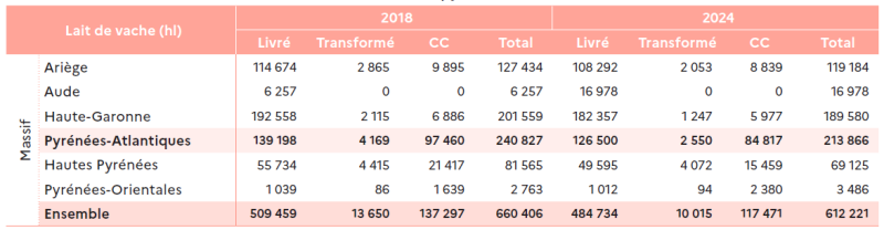 Le massif assure une production de 612 000 d’hl de lait de vache dont 77 % du volume est livré à l’industrie et 22 % commercialisé en vente directe. Le massif représente 27 % de la production de lait de vache des départements pyrénéens (09, 11, 31, 64, 65 et 66). Les Pyrénées atlantiques assurent un peu plus du 1/3 de cette production devant la Haute-Garonne et l’Ariège (cf. Tableau 1). La production a baissé de 7 % en 2024 par rapport à 2018 en particulier dans les Hautes-Pyrénées, Haute- Garonne et Pyrénées Atlantiques.