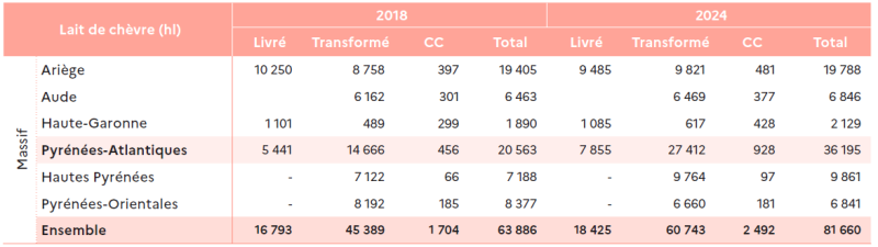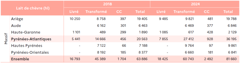 La part transformée à la ferme est très majoritaire avec 71 % du lait produit destinée à des productions fermières. Les Pyrénées-Atlantiques et l’Ariège sont les deux principaux départements contributeurs respectivement 44 % et 25 % de la production de lait de chèvre du massif. La production de lait de chèvre est en progression depuis 2018, +28 % dans le massif et en particulier dans les Pyrénées-Atlantiques (+ 76 %).