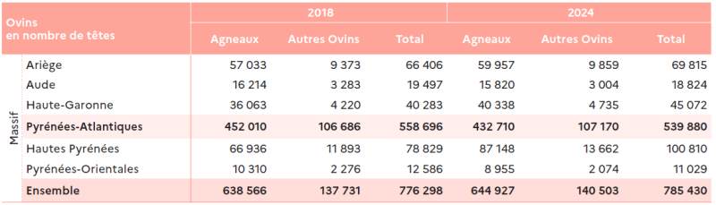 Le massif des Pyrénées produit un volume d’agneaux significatifs (13,5 %) au regard des productions des autres massifs. La production pyrénéenne avoisine en 2024, les 600 000 têtes d’agneaux, le Massif central plafonne à 1,6 millions de têtes et les Alpes autour de 250 000