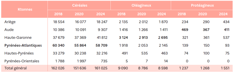 Pour les céréales, la production réalisée dans les communes du massif peut être estimée à 160 000 tonnes pour les 6 départements. La production de maïs est largement majoritaire notamment pour les Pyrénées-Atlantiques et les Hautes-Pyrénées. La part de la production dans le massif ne représente que 8 % de la production totale des six départements. La production de céréales est relativement stable depuis 2018. Pour la production d’oléagineux, les communes du massif ont une production estimée à 9 000 tonnes, soit 3 % de la production des départements avec une tendance à la baisse depuis 2018. Pour la production de protéagineux à graines, la production du massif se situe à 1 500 tonnes soit 5 % de la production des départements et une évolution positive depuis 2018 (Cf. tableau 8).
