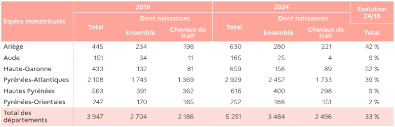 Le cheptel équin des départements du massif est en forte progression (chevaux, ânes, poneys). Il progresse de 33 % entre 2018 et 2024 pour les départements du massif (ensemble des communes). Les naissances des animaux de trait sont en progression en Ariège et Pyrénées-Atlantiques et en légère baisse ailleurs. Source base de données institut français du cheval (SIRE).La production de poulains est principalement destinée à l’exportation pour engraissement en Espagne et une partie notamment pour la production des Pyrénées-Atlantiques est exportée vers le Japon.