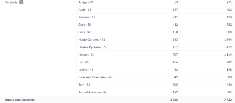 Vous trouverez en PJ un tableur en Libre office donnant la liste des plus de 5600 cantines occitanes inscrites dans la plateforme "ma cantine" au 31/03/2026, dont 3855 ont télédéclaré leurs résultats 2025 en ce début d’année 2026 dans la région Occitanie.