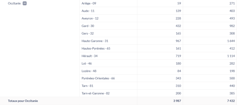 Vous trouverez en PJ un tableur en Libre office donnant la liste des plus de 5600 cantines occitanes inscrites, hors ministère des Armées, dans la plateforme "ma cantine" au 31/03/2026, dont 3855 ont télédéclaré leurs résultats 2025 en ce début d’année 2026 dans la région Occitanie.