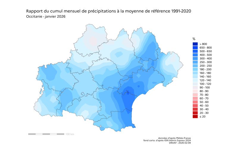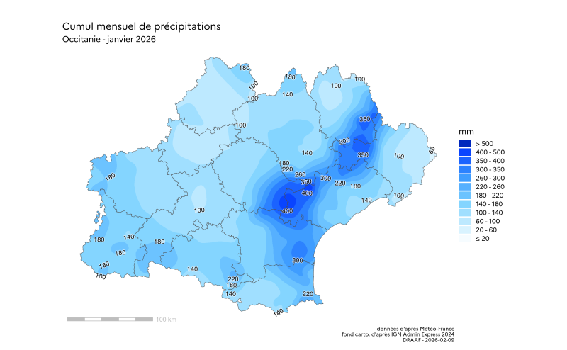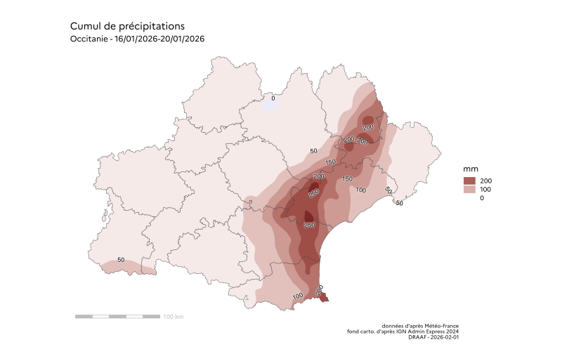 "La carte de la pluviométrie lors des évènements de type orageux du 16 au 20 janvier 2026 ne peut être interprétée comme la carte des dégâts causés aux cultures, en raison de la nature très localisée et très hétérogène de ces phénomènes climatiques, accompagnés ou non de vents extrêmes, de grêles, d’impacts de foudre etc. Elle est cependant très indicative de la localisation potentielle de ces dégâts à l’échelle régionale" -
