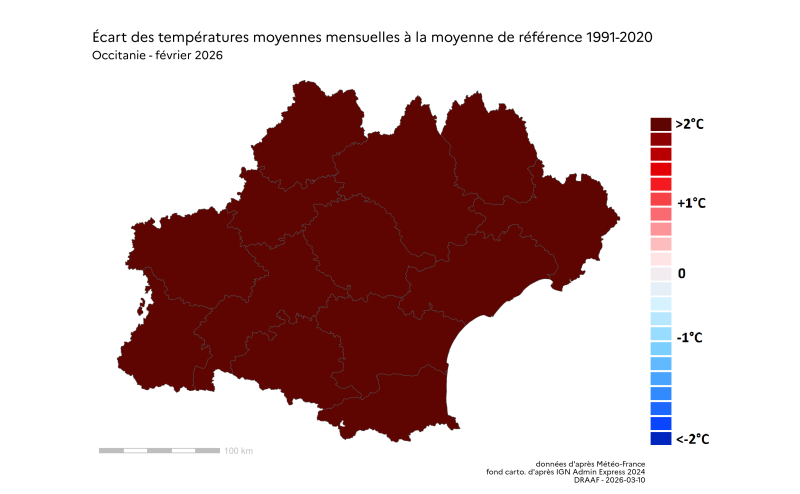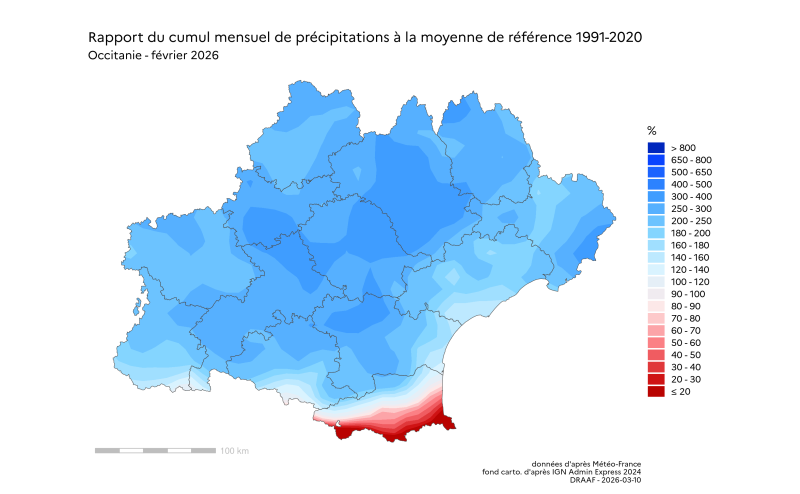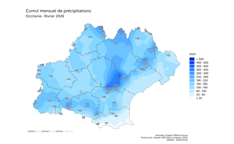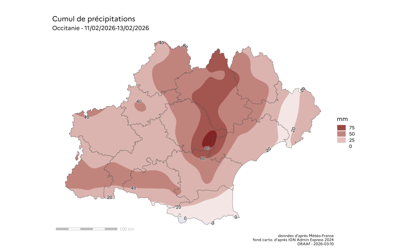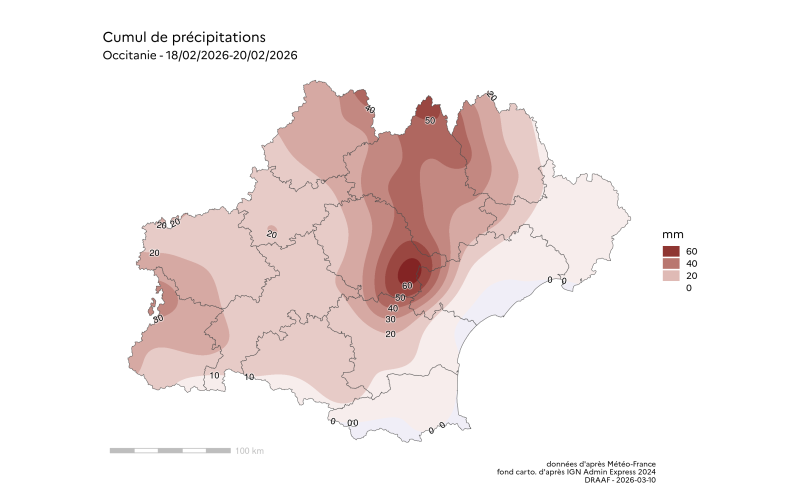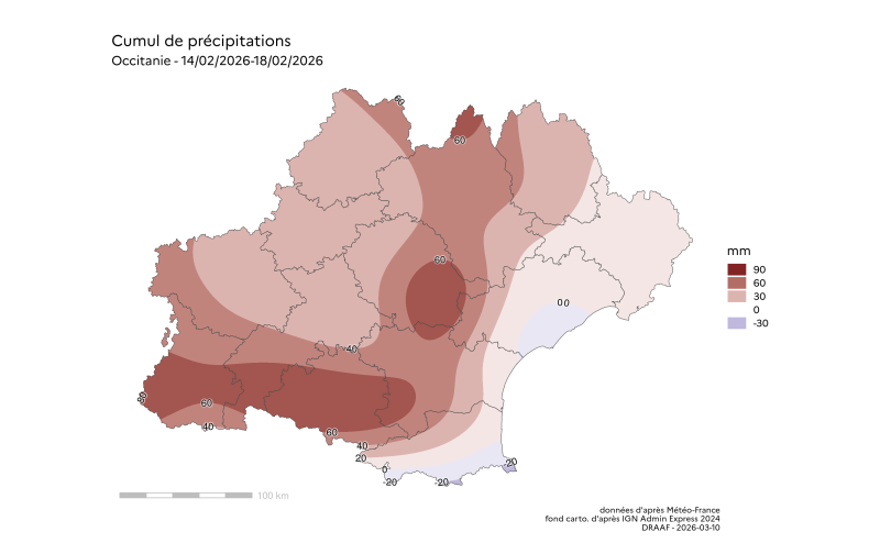 "Les cartes de la pluviométrie lors des évènements de type orageux du mois de février 2026, ne peuvent être interprétée comme la carte des dégâts causés aux cultures, en raison de la nature très localisée et très hétérogène de ces phénomènes climatiques, accompagnés ou non de vents extrêmes, de grêles, d’impacts de foudre etc. Elle sont cependant très indicatives de la localisation potentielle de ces dégâts à l’échelle régionale"