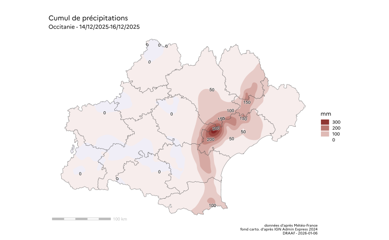 Source : Météo France, normales 1991-2020, traitement SRISET Source : Météo France, normales 1991-2020, traitement SRISET Source : Météo France, traitement SRISET Épisodes dans le Haut-Languedoc et les Pyrénées-Orientales du 14 au 16 décembre 2025
