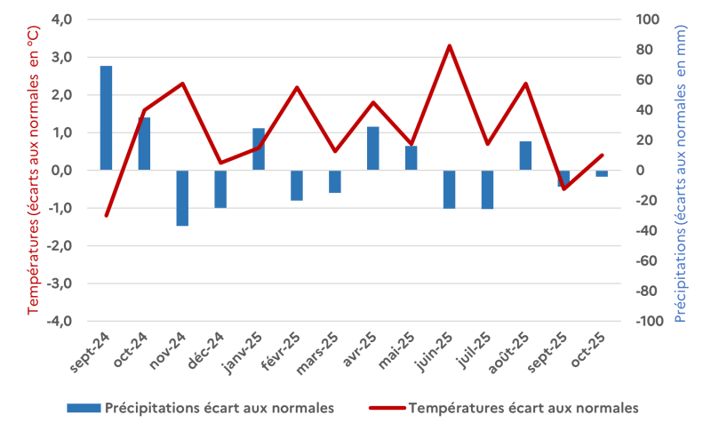 En septembre, les températures sont légèrement en dessous des normales saisonnières. Après des pics de chaleur jusqu’au 18 septembre (32°C à 33°C), les températures maximales ont chuté de 17 à 19°C en seulement 6 jours. Les précipitations ont été très déficitaires, affichant un recul moyen de 31 % à l’échelle régionale, déficit particulièrement marqué dans l’Hérault (-68%), le Gard (- 54%) et l’Aude (-51%). Les Pyrénées catalanes, le piémont pyrénéen et le Quercy, ont toutefois bénéficié d’excédents localisés.