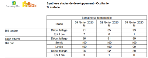 Ce froid n’a pas eu d’impact sur les cultures d’hiver sauf pour les semis tardifs. Il est même plutôt bénéfique pour l’état sanitaire des cultures et pour calmer les attaques de pucerons. La campagne démarre bien, au 15 janvier la totalité des céréales à paille de la région ont débuté le tallage. Les cultures sont au démarrage du stade épi 1cm.