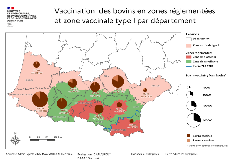 À la date du 13 janvier 2026, 90.2% du cheptel des dix départements du Sud-Ouest concernés est vacciné, soit 651 597 bovins vaccinés.