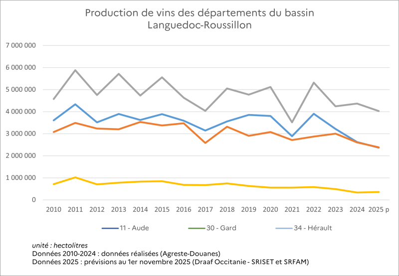 Production viticole 2025 en Occitanie : troisième année consécutive de repli de la production dans les deux bassins Languedoc-Roussillon et Sud-Ouest.