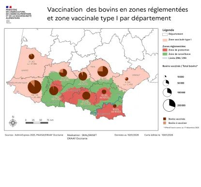 À la date du 10 janvier 2026, 88% du cheptel des dix départements du Sud-Ouest concernés est vacciné, soit 635 881 bovins vaccinés.