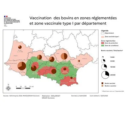 À la date du 2 janvier 2026, 70,2% du cheptel des dix départements du Sud-Ouest concernés est vacciné, soit 506 741 bovins vaccinés.