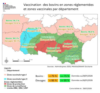 À la date du 29 janvier 2026, 96,5 % du cheptel des dix départements du Sud-Ouest concernés est vacciné, soit 697 334 bovins vaccinés.