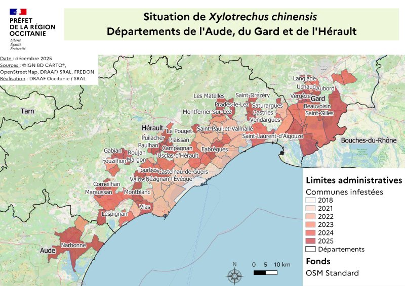 Liste des communes officiellement trouvées infestées par Xylotrechus chinensis dans l’Hérault, l’Aude et le Gard (décembre 2025)